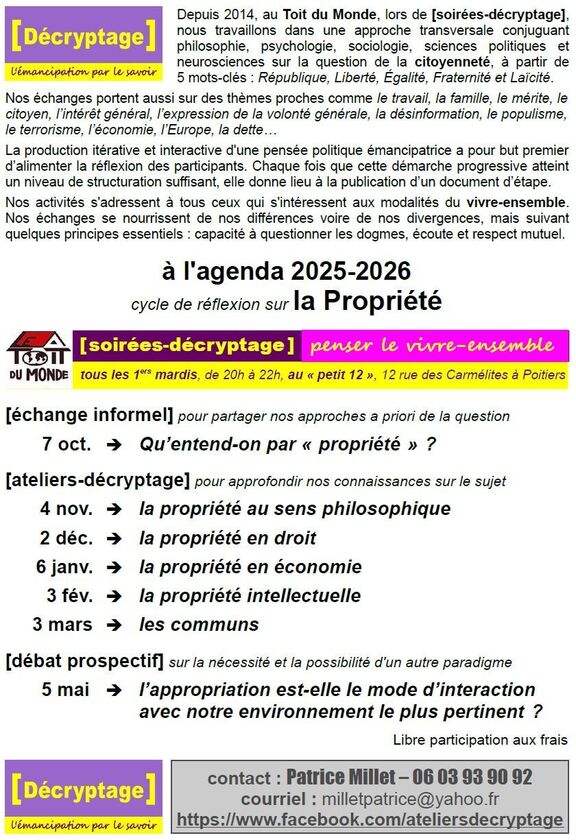 Et comme d'habitude, on ouvre le cycle de réflexion par un [échange informel], mardi 7 octobre à 20h, au « Petit 12 » 12 rue des carmélites à Poitiers.