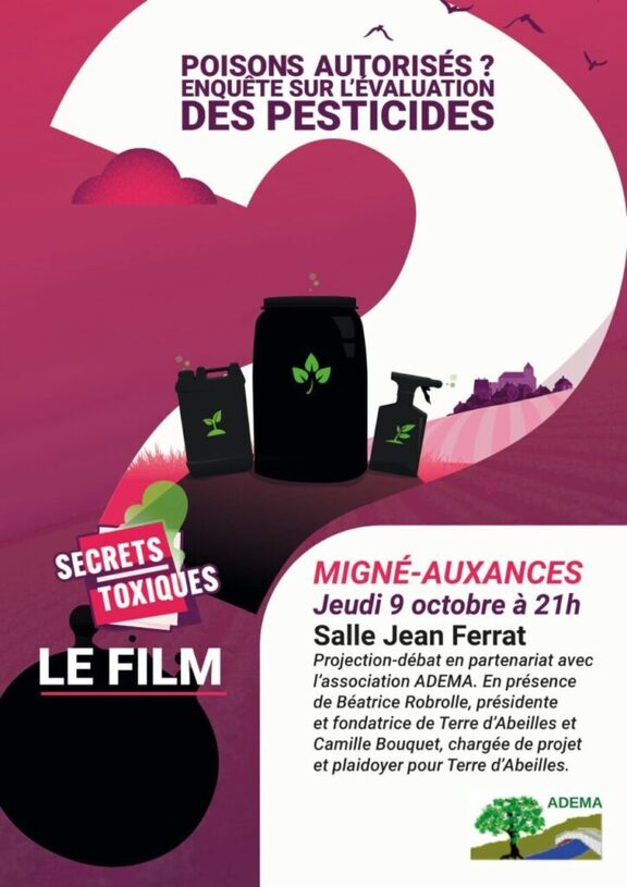 L'ADEMA vous invite à venir voir le film Secrets toxiques le 9 octobre à 21h à la salle Jean Ferrat à Migné-Auxances puis à débattre. L'entrée est libre