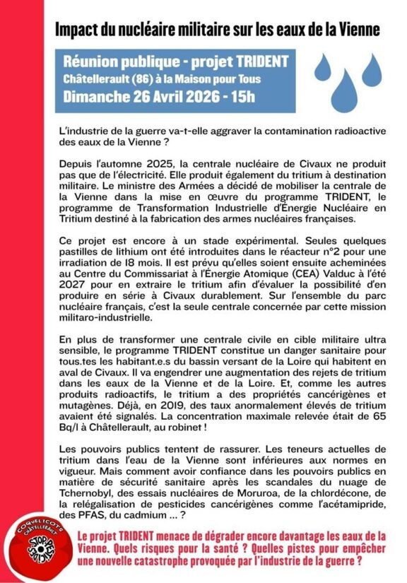 Le ministre des Armées a décidé de mobiliser la centrale de la Vienne dans la mise en œuvre du programme TRIDENT, le programme de Transformation Industrielle d'Énergie Nucléaire en Tritium destiné à la fabrication des armes nucléaires françaises. En plus de transformer une centrale civile en cible militaire ultra sensible, ce programme constitue un danger sanitaire pour tous.tes les habitant.e.s du bassin versant de la Loire qui habitent en aval de Civaux. Quels risques pour la santé ? Quelles pistes pour empêcher une nouvelle catastrophe provoquée par l'industrie de la guerre ?