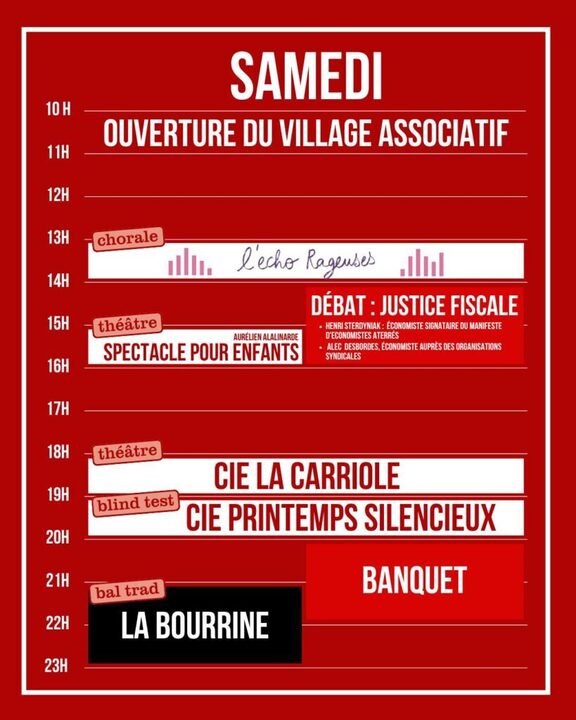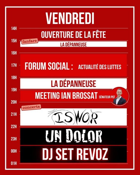 VENDREDI : 14h : Ouverture 15h30 : Fanfare - La Dépanneuse 16h-18h : Forum social - les actualités de la lutte 18h-19h : La Dépanneuse 19h : Meeting - Ian Brossat, sénateur PCF 20h30-22h : ISWOR 22h-23h30 : Undolor 23h30-1h : DJ set Revoz SAMEDI : 10h : Ouverture du village associatif 13h-14h : Chorale - Les Échorageuses 14h-16h : Débat sur la justice fiscale 15h-16h : Spectacle pour enfants 18h-19h : Théâtre - Compagnie La Carriole 19h-20h : Blind test - Compagnie Printemps Silencieux 20h-22h : Banquet 21h-23h : Bal trad - La Bourrine Une fête gratuite, politique, culturelle… À Biard, salle Guillaume d'Aquitaine .